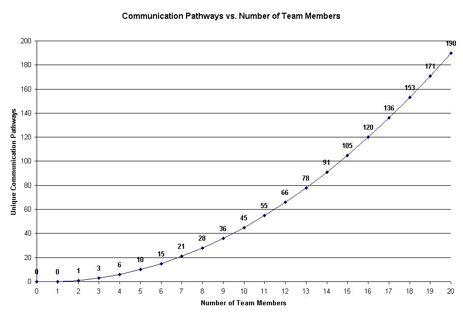 In my colleague’s example, the number of communication pathways increase non-linearly from 45 to 190 after the team doubles in size. Or if you want percentages, changing the team size from 10 to 20 is a 400% increase in communication overhead. Wow! I would call that communication overload.